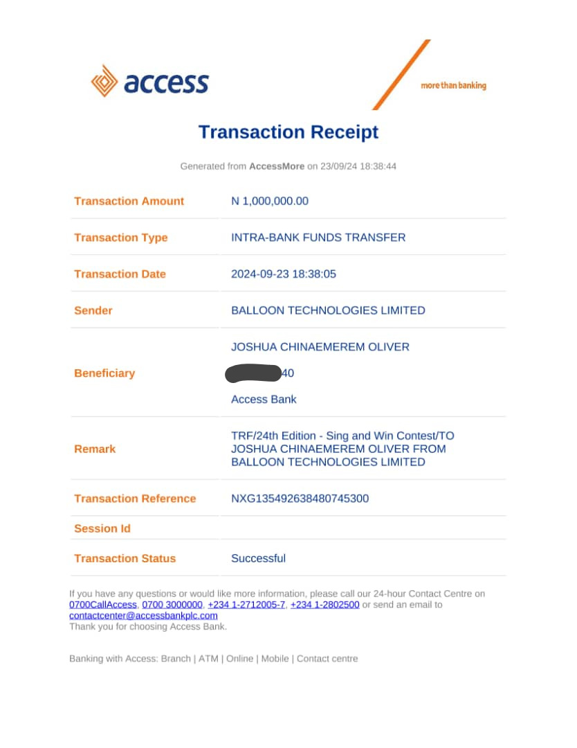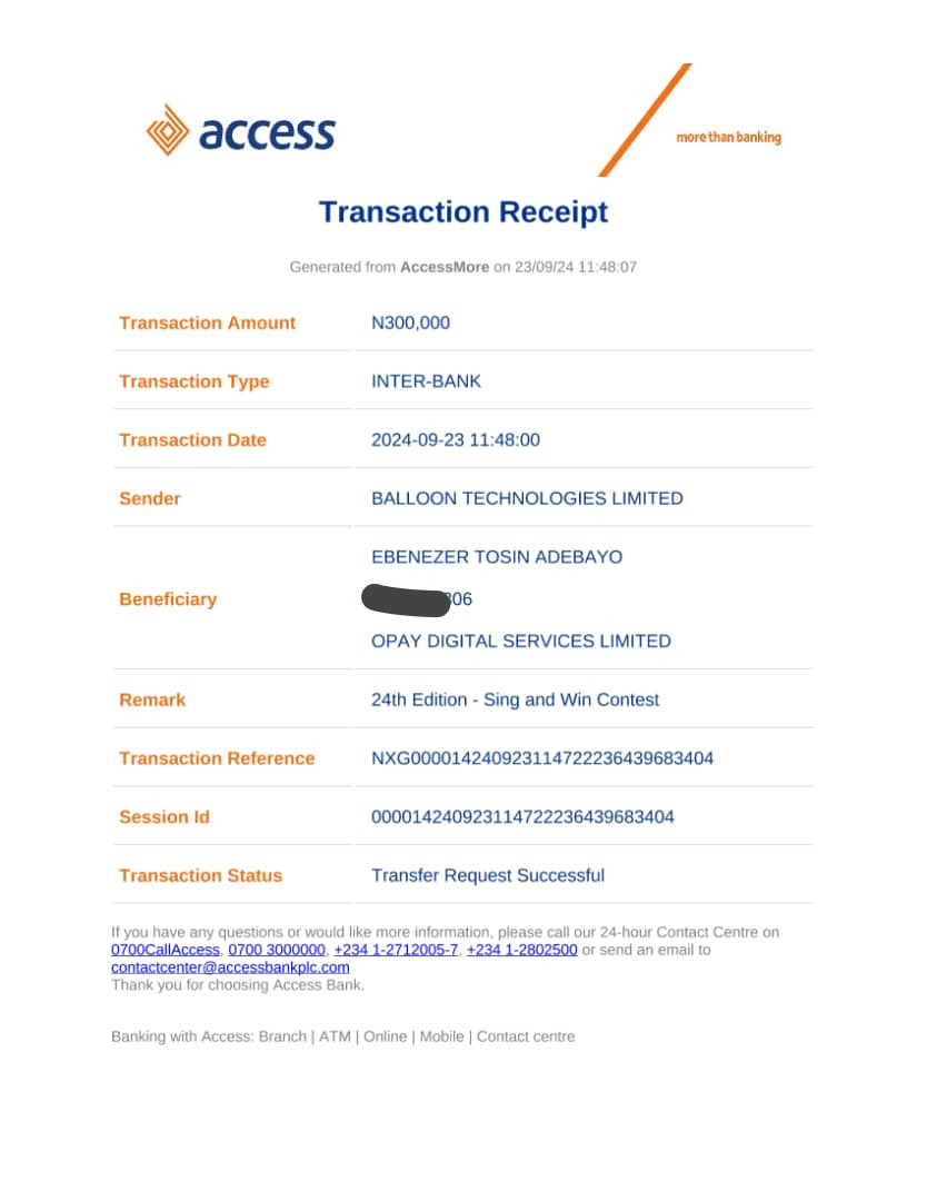 We say a big congratulations to Adebayo Ebenezer for emerging as the 1st Runner Up of the 24th Edition - Sing and Win Contest [Completed]