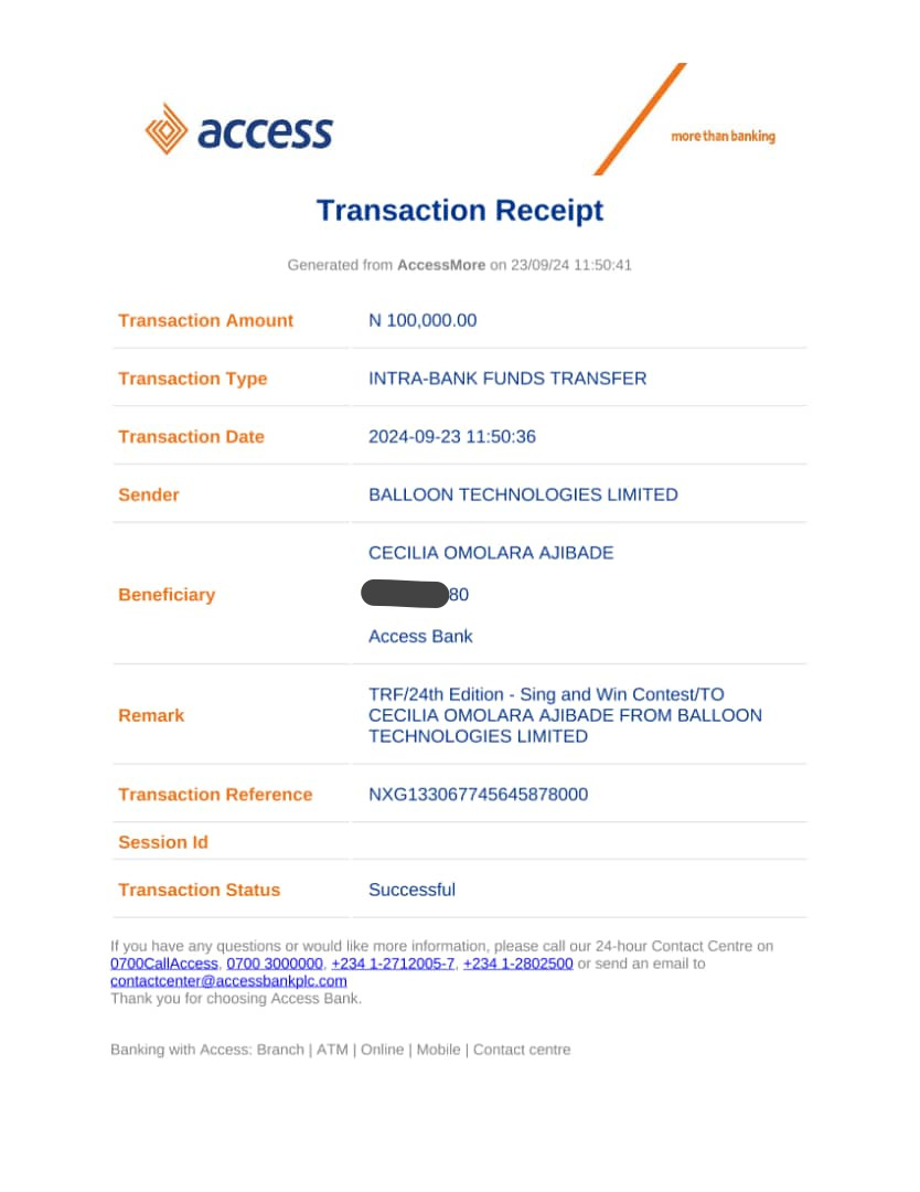 We say a big congratulations to Ajibade Omolara for emerging as the 2nd Runner Up of the 24th Edition - Sing and Win Contest [Completed]