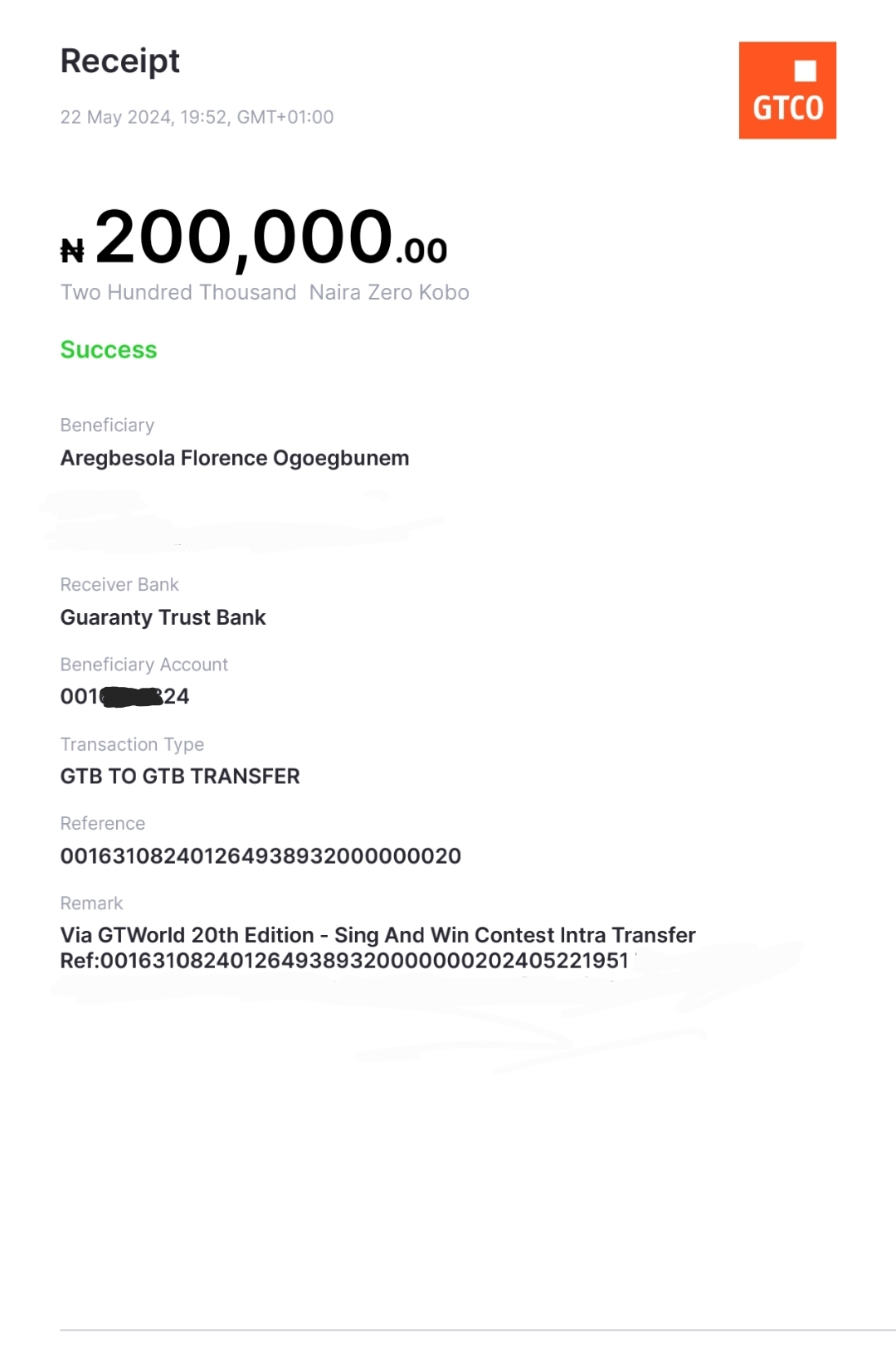 We say a big congratulations to Aregbesola Florence ogoegbunem for emerging as the 1st Runner Up of the 20th Edition - Sing and Win Contest (Special Edition) [Completed]