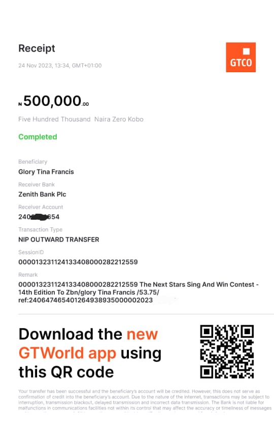 Here is a receipt of the transfer we made to Francis Glory Tina