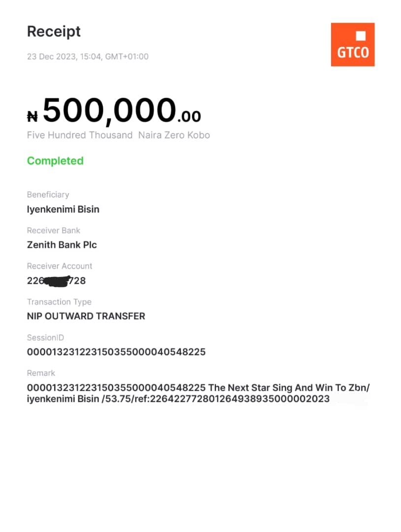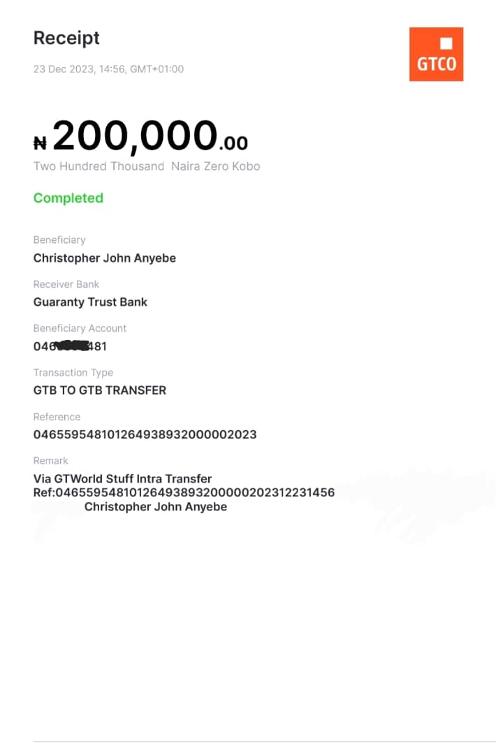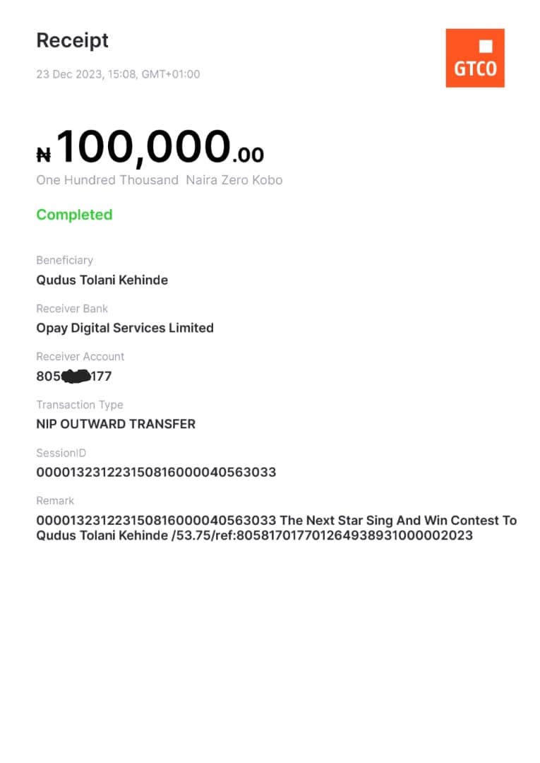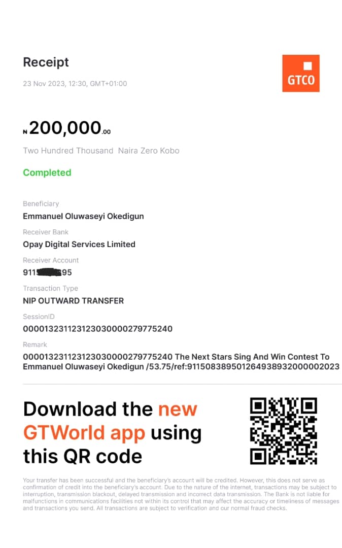Here is a receipt of the transfer we made to Okedigun Emmanuel